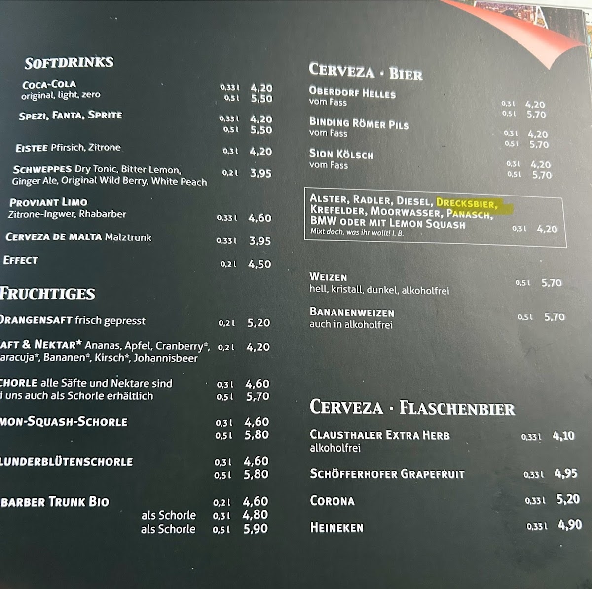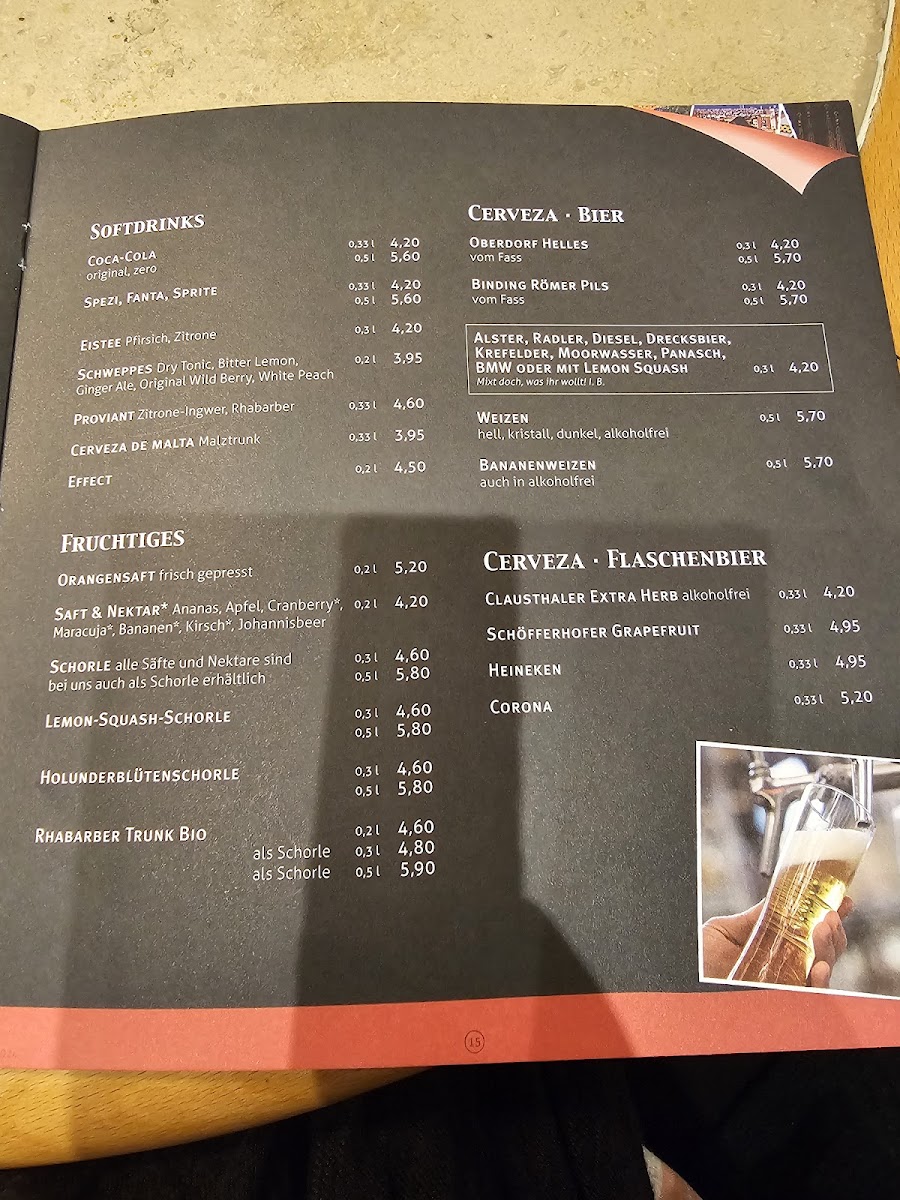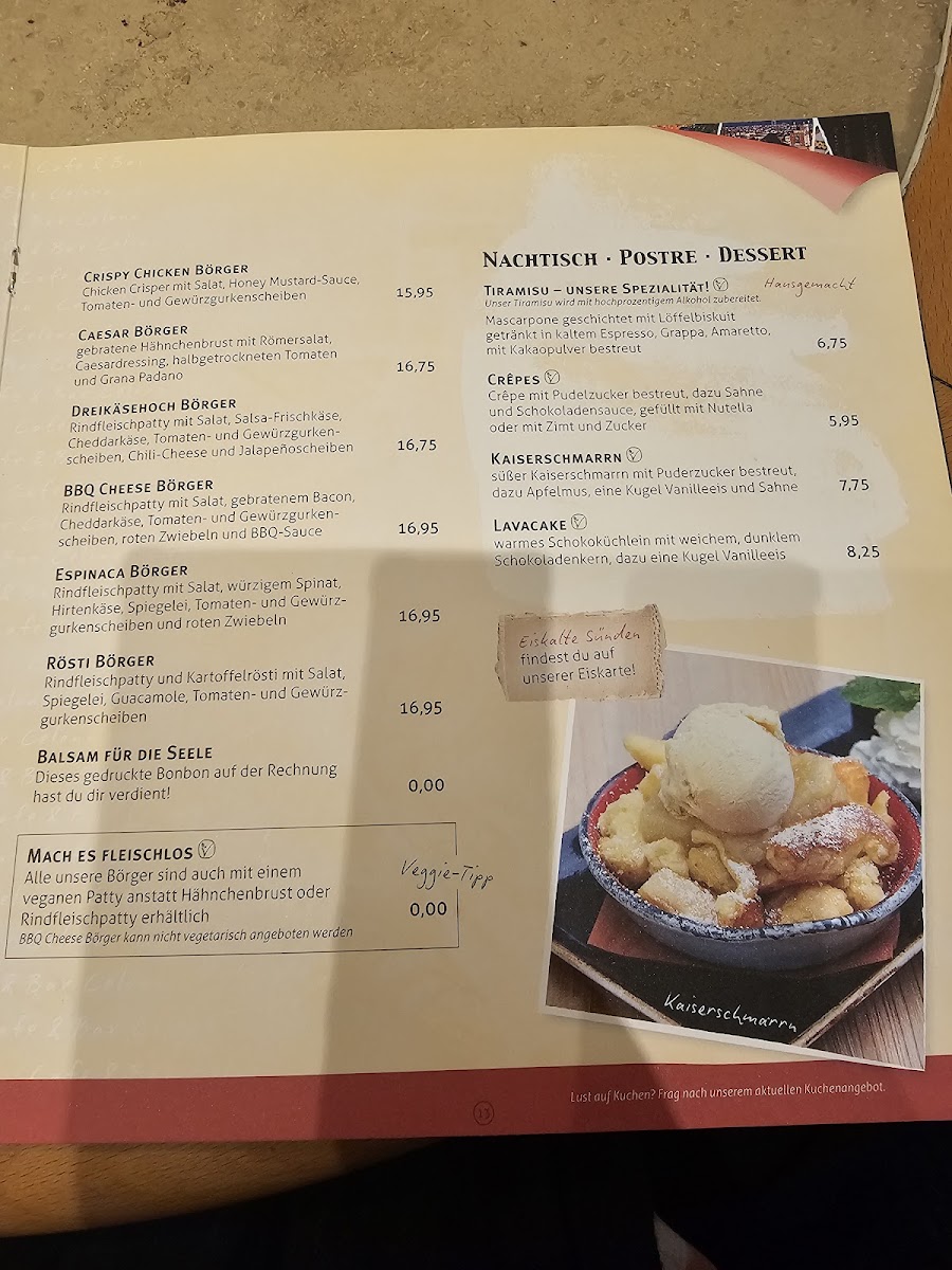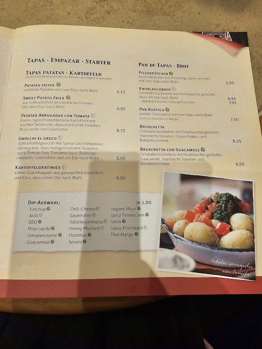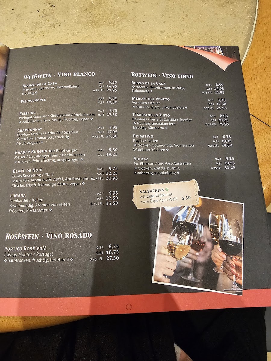Tapas lovers will rejoice at the variety available—such as Salsachips, crispy chips served with your choice of dips for just €5.25, or the indulgent Überbackene Salsachips, topped with chili cheese, for €6.25. Don’t miss out on the Chili con Carne Salsachips, a perfect fusion dish that combines the crispy and the hearty for €8.50.
