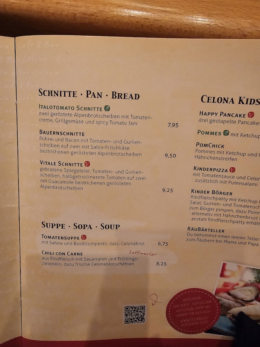 The adult menu offers a savory selection, including the Tomatensuppe, a smooth tomato soup drizzled with cream and basil pesto, priced at €6.25. If you're in the mood for something heartier, try the Chili con Carne at €7.75, a robust portion that is both flavorful and filling, paired perfectly with rustic Celona bread.